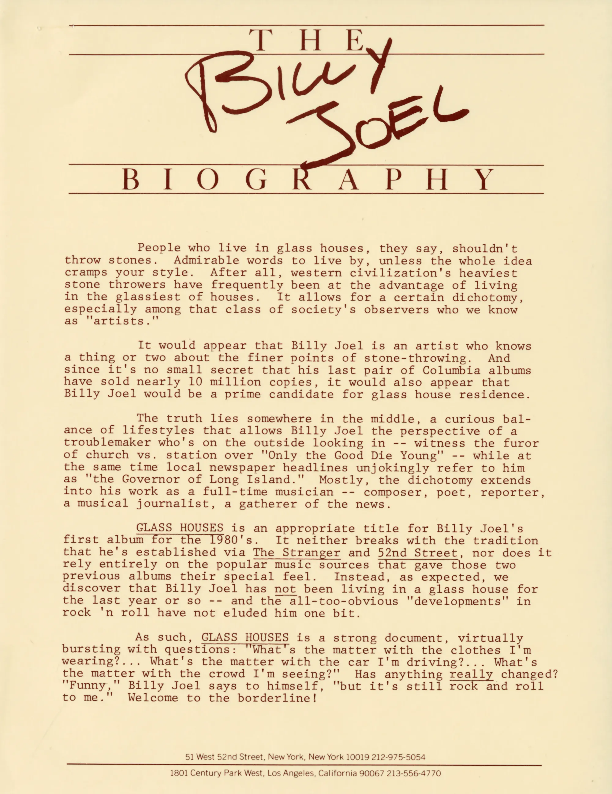 “Who are we kidding?” Billy asks in a moment of bemused frustration. “Do I have to jive? Be hype and jive? About my new album, Glass Houses? Do I have to keep saying Glass Houses? ‘Glass Houses? This is Billy Joel: Glass Houses.’”