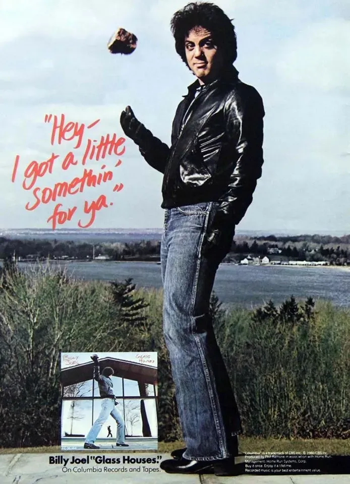 “Hey — I got a little somethin’ for ya,” a leather-jacketed Billy challenged in a print ad for Glass Houses, finally released to the public on March 12, 1980. A rock, tossed upward, is frozen in mid-air next to the singer. On the album sleeve, Billy faces away from the listener, with that rock cocked back at an impressively windowed house on Oyster Bay, Long Island — Billy’s own, it turns out.